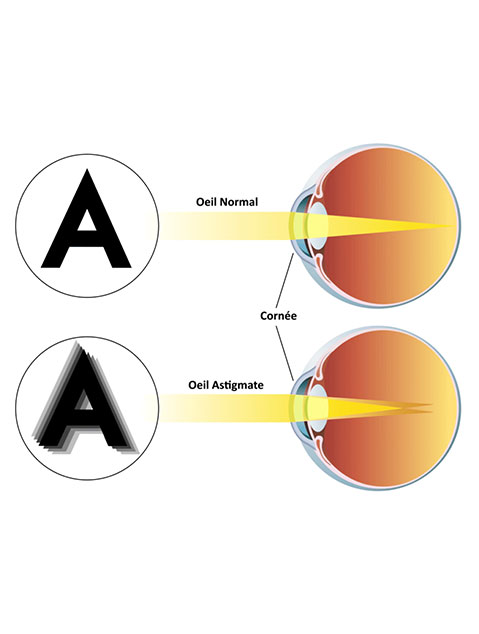 Lorsque la cornée est légèrement déformée, plus ovale que ronde, il arrive qu’elle focalise la lumière à différents endroits de la cornée. L’image perçue est alors trouble. L’astigmatisme peut également découlé d’un défaut du cristallin, qui prend la forme d’un ballon de rugby plutôt que d’une sphère.