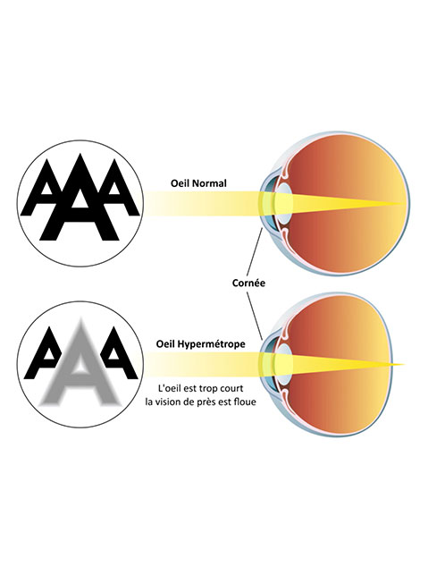 Un oeil est dit hypermétrope lorsque le cristallin focalise l’image derrière la rétine en vision de près. Contrairement à la myopie, l’oeil est capable de corriger ce défaut en faisant un effort de mise au point. L’oeil doit alors s’accommoder en permanence à la vision de près.