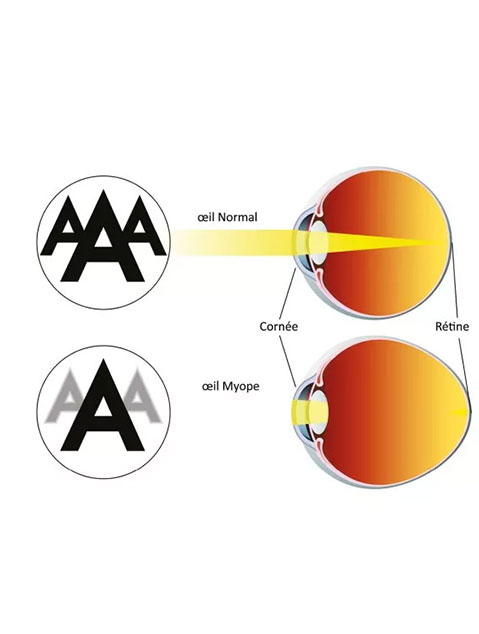 Un oeil myope est un oeil dont le cristallin reste trop bombé en vision de loin. L’image ne se forme pas sur la rétine, mais légèrement avant. Quelqu’un de myope voit donc de manière nette ce qui est proche, et flou ce qui est éloigné.